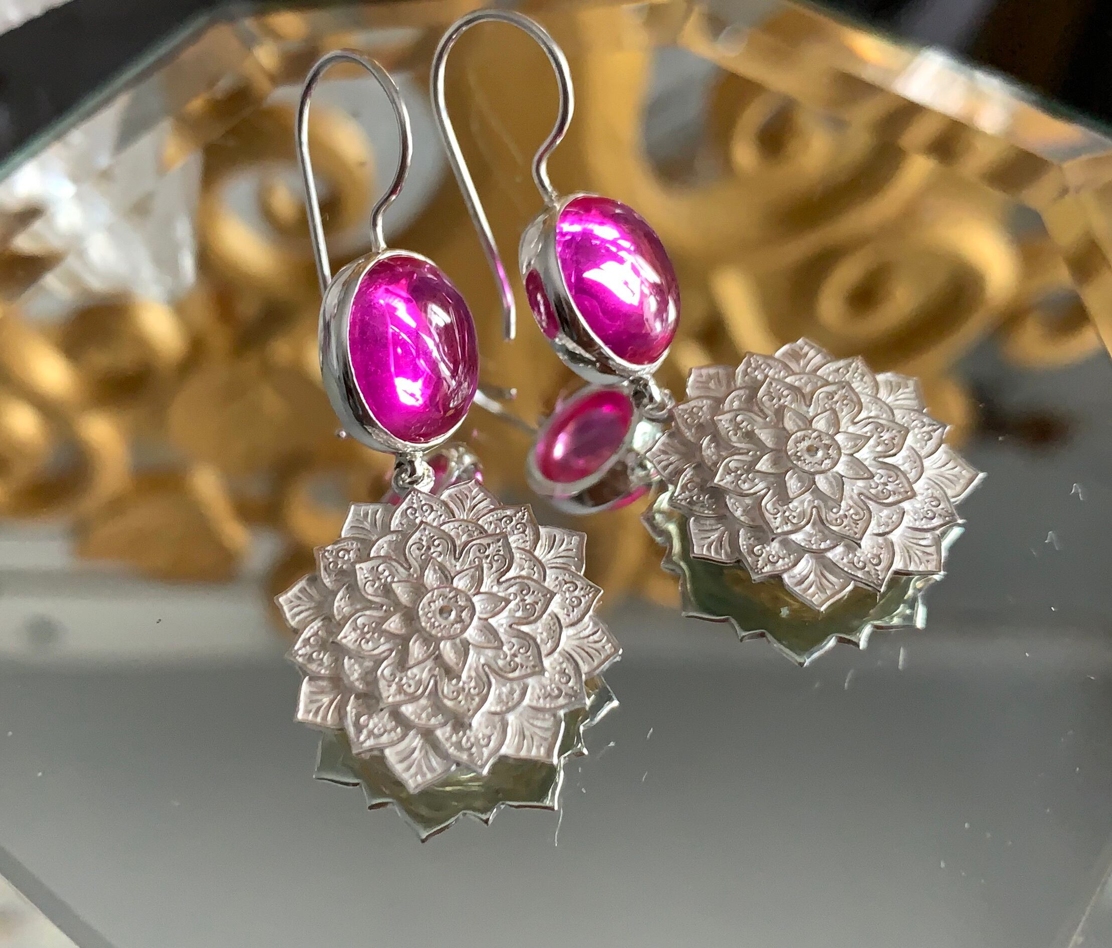 このピアスは、3Dデザインで作られており、一つ一つの曼荼羅が融合し、独特の存在感を醸し出しています。身に着けることで、視線を惹きつけること間違いなしです!高品質のシャムルビー宝石を使用しており、特にバンコクスター(星)の煌めきが素晴らしいです。